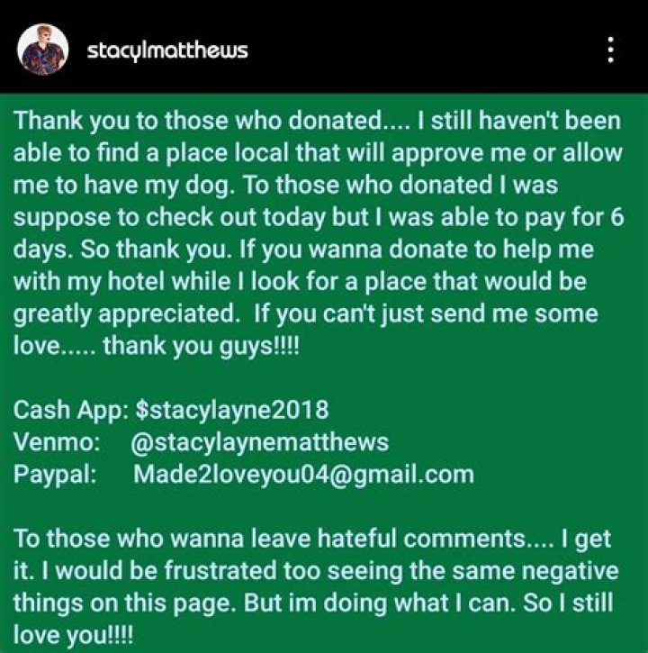 Answer: Stacy Layne Matthews has been open about her struggles with addiction and homelessness. These issues have made it difficult for her to maintain a stable income and housing.
