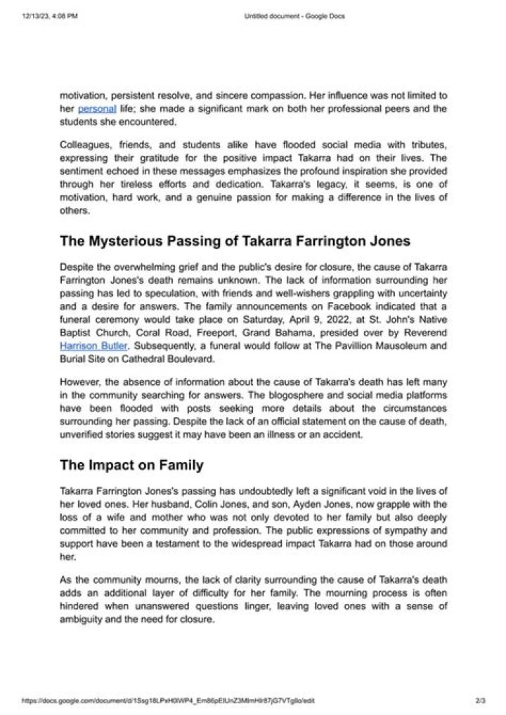 The obituary of Takarra Farrington-Jones is a reminder of the fragility of life and the importance of cherishing our loved ones. Takarra was a kind and compassionate person who always put others before herself. She will be deeply missed by all who knew her.